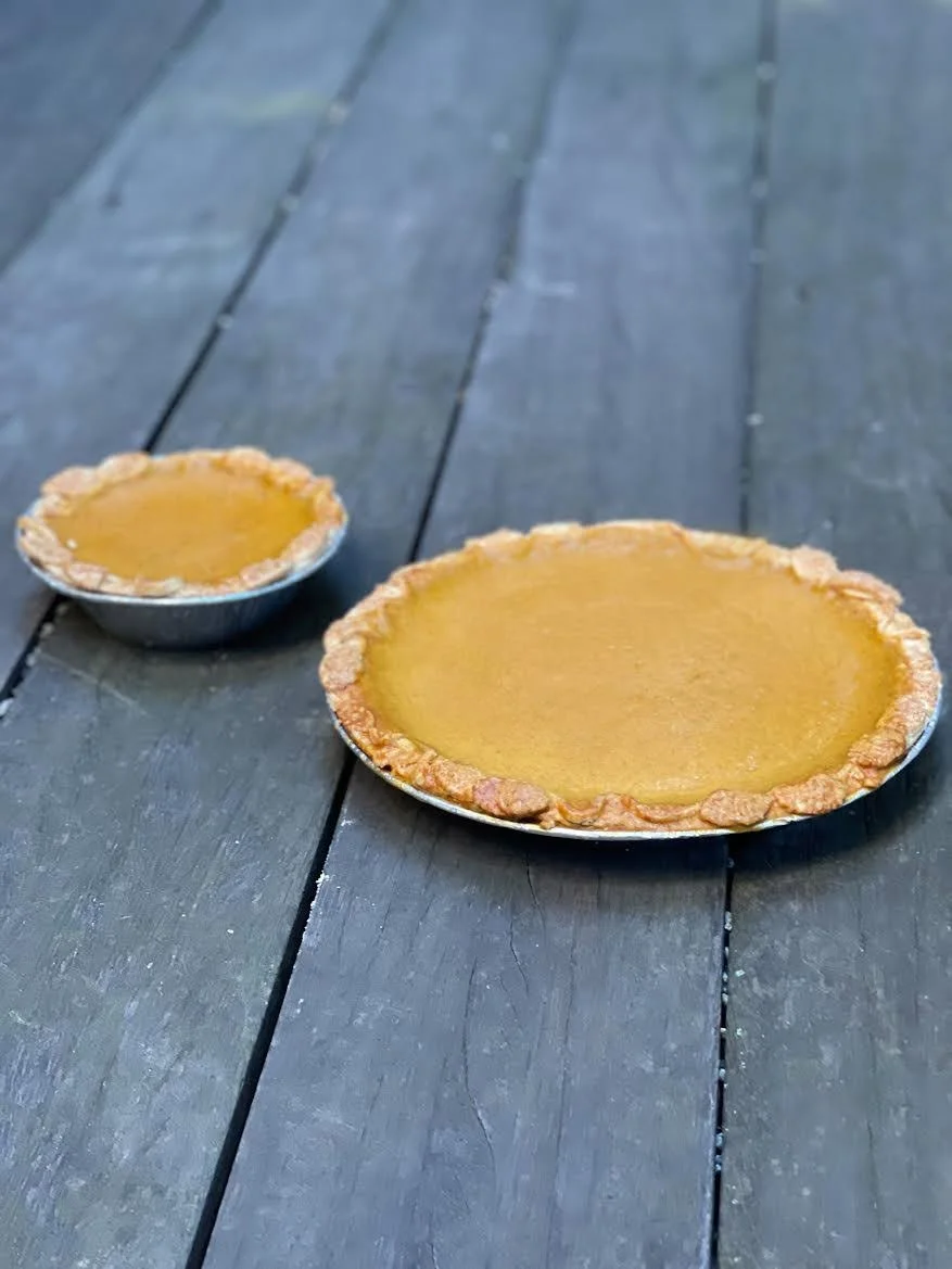 Order Your Pumpkin Custard Pie: Our Take on Pumpkin Pie Made with pumpkins and winter squashes grown locally Long Island (no cans here) gently spiced so you can taste the amazing flavor of the heirloom pumpkins and baked into the most creamy, custardy, smooth pumpkin pie possible on top of our flaky buttery crust!