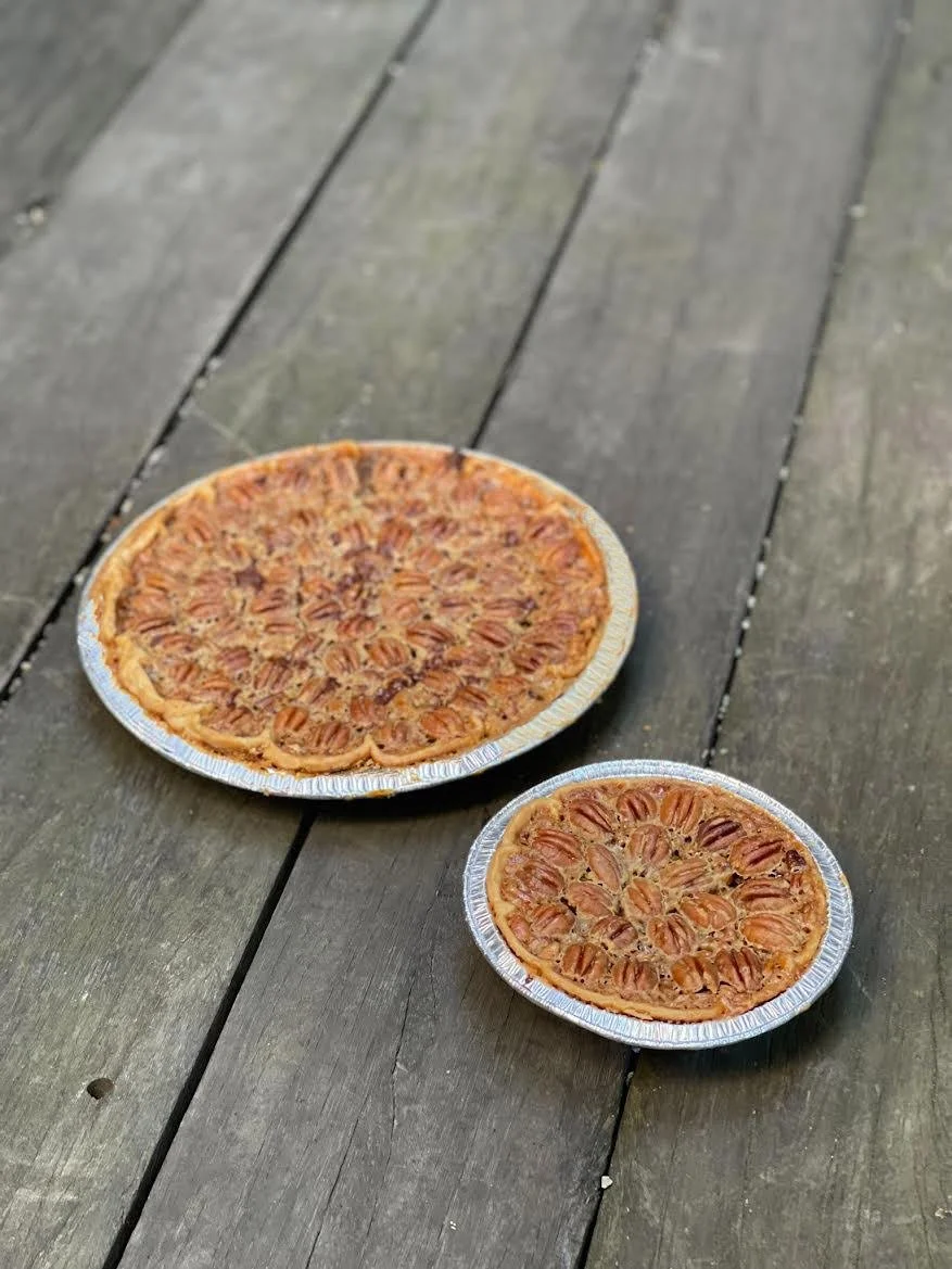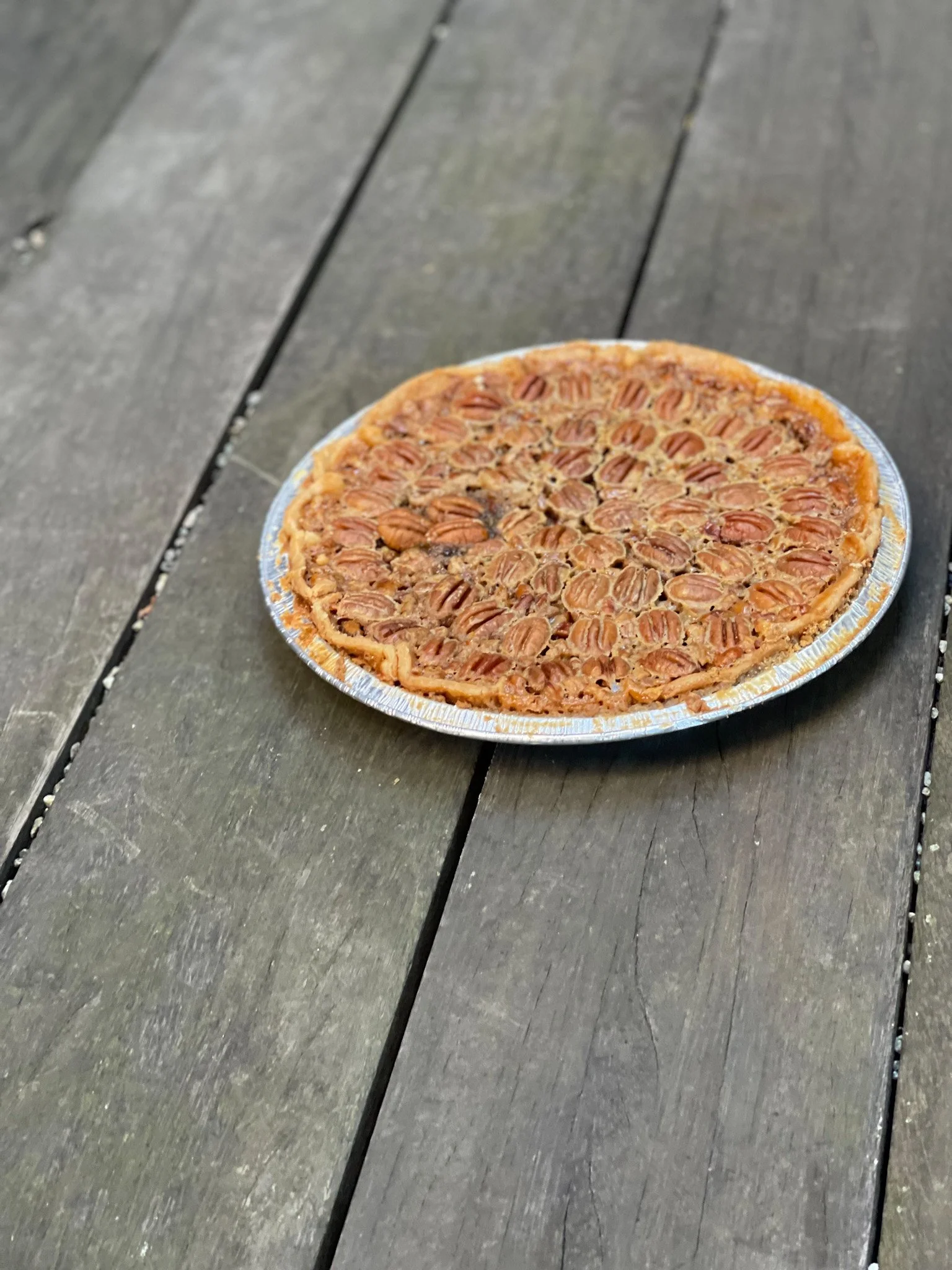 Our take on Pecan Pie Made with tuns Georgia pecans, maple syrup and brown sugar baked into the most gooey, custardy, rich pecan pie possible on top of our flaky buttery crust!