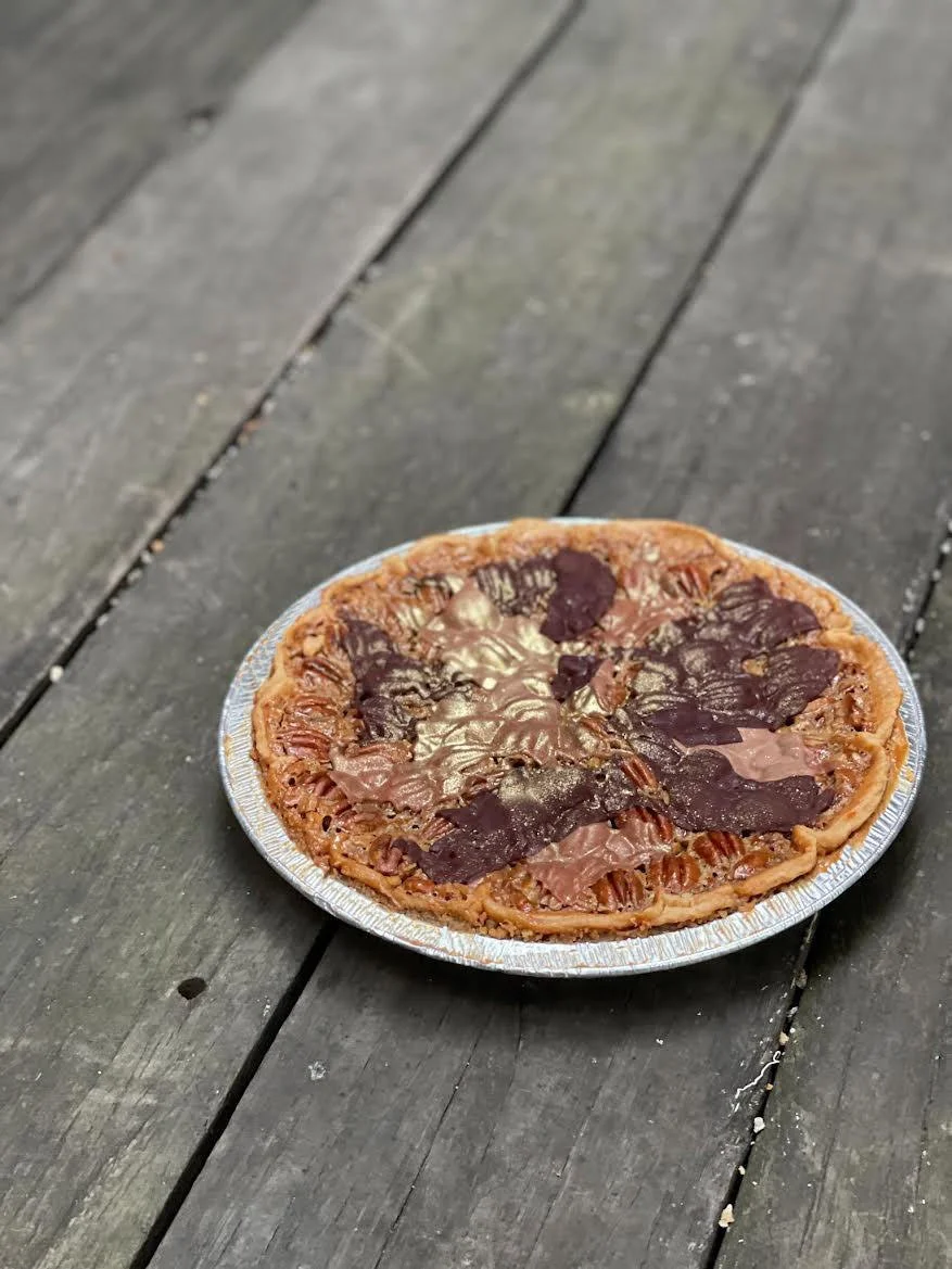 Our take on Pecan Pie Made with tuns Pearson Farm Georgia pecans, maple syrup and brown sugar studded with Valhrona Dark Chocolate baked into the most gooey, custardy, rich pecan pie possible on top of our flaky buttery crust, all topped of with dark and milk chocolate brushed with gold!